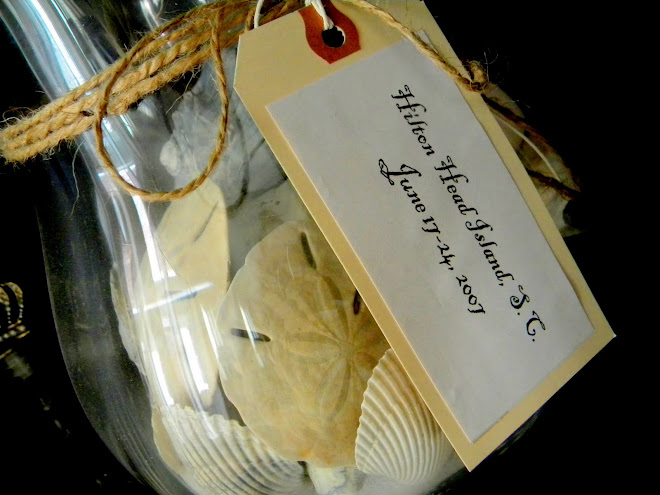 On my bookcase is a beautiful jar. Inside are sand, shells and sand dollars collected on a family vacation in South Carolina. I tied a jute ribbon around the lip of the jar with a tag attached. On the tag is the date of our trip. When I see it there I am reminded of a time when my girls were just a little smaller, and life was just a little simpler. In my mind I can see them riding their bikes along the sand at the waters edge. In my heart, I can feel the swell of peace, remembering how warm the water felt and how sweet, special, and rare those moments were. These everyday treasures, simply displayed, represent so many things that are important to me; the beauty of nature, the preciousness of family, the fleetingness of time. That little sand jar is part of what makes my house a home.